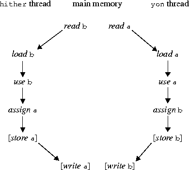 In what order may the operations by the main memory occur? The only constraint is that it is not possible both for the write of a to precede the read of a and for the write of b to precede the read of b, because the causality arrows in the diagram would form a loop so that an action would have to precede itself, which is not allowed. Assuming that the optional store and write operations are to occur, there are three possible orderings in which the main memory might legitimately perform its operations. Let ha and hb be the working copies of a and b for the hither thread, let ya and yb be the working copies for the yon thread, and let ma and mb be the master copies in main memory. Initially ma=1 and mb=2. Then the three possible orderings of operations and the resulting states are as follows:
