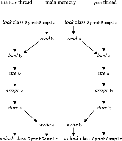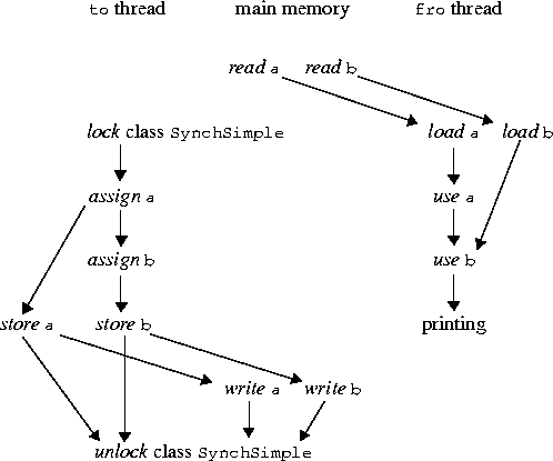 In what order may the operations by the main memory occur? Note that the rules do not require that write a occur before write b; neither do they require that read a occur before read b. Also, even though method to is synchronized, method fro is not synchronized, so there is nothing to prevent the read operations from occurring between the lock and unlock operations. (The point is that declaring one method synchronized does not of itself make that method behave as if it were atomic.)