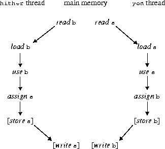 b is copied into a, a is copied into b, or the values of a and b are swapped; moreover, the working copies of the variables might or might not agree. It would be incorrect, of course, to assume that any one of these outcomes is more likely than another. This is one place in which the behavior of a program is necessarily timing-dependent.Of course, an implementation might also choose not to perform the store and write actions, or only one of the two pairs, leading to yet other possible results.