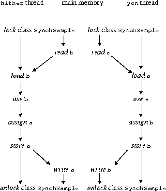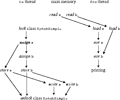 In this case the method to will be forced to store the assigned values back to main memory before the unlock action at the end of the method. The method fro must, of course, use a and b (in that order) and so must load values for a and b from main memory.The total set of actions may be pictured as follows: