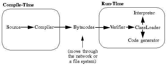Code is checked for compliance with these rules by a part of the loader called the verifier. It traverses the byte codes, constructs the type state information, and verifies the types of the parameters to all the opcodes. The following illustration shows the flow of code from Java source code to execution by the runtime system.